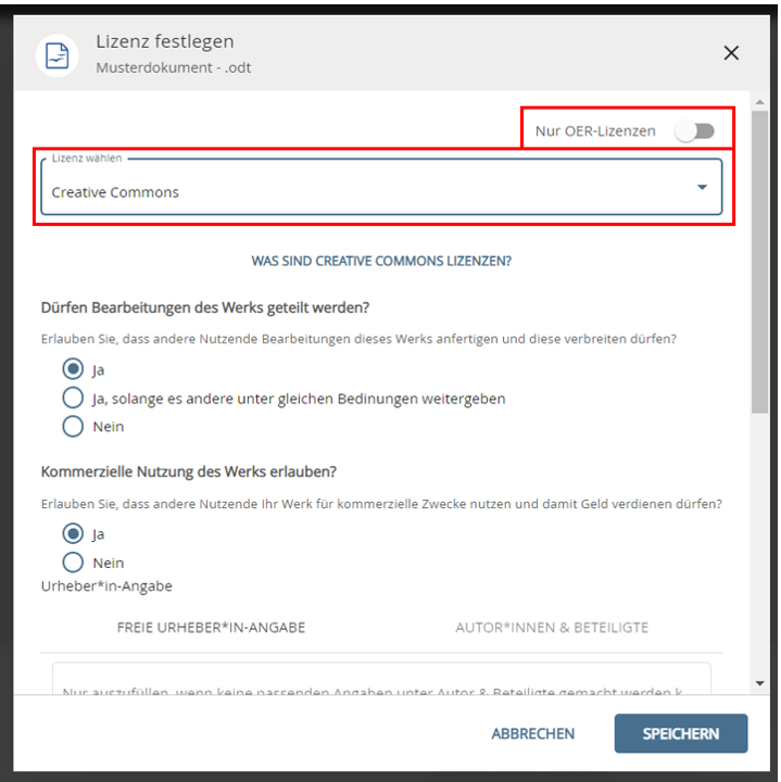 Wählen Sie im folgenden Fenster im Dropdown-Menü „Creative Commons“ aus, werden Sie mithilfe zweier Fragen durch den weiteren Prozess der Lizenzwahl geführt.